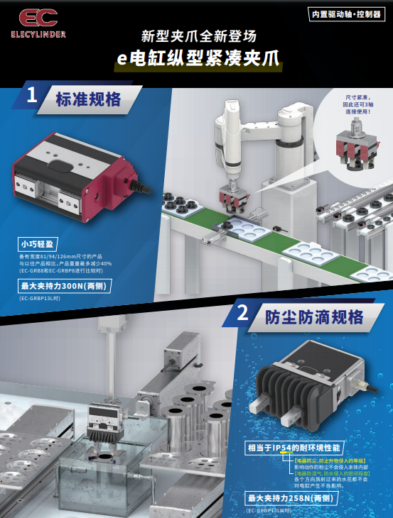 小巧輕盈 備有寬度81/94/126mm尺寸的產(chǎn)品與以往產(chǎn)品相比,產(chǎn)品重量最多減少40%(EC-GRB8和EC-GRBP8進(jìn)行比較時(shí)) 最大夾持力300N(兩側(cè)) (EC-GRBP13L時(shí))